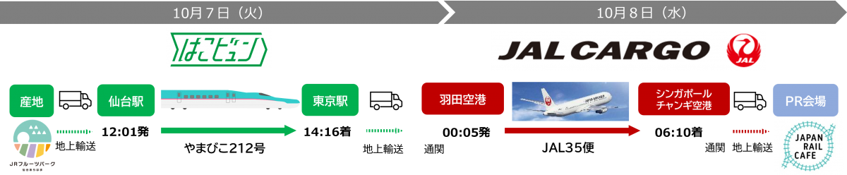 東日本旅客鉄道(以下、JR東日本)と日本航空(以下、JAL)は、両社グループが連携した海外輸送トライアルを2025 年10 月7 日・8日の2日間に実施する。今回の取り組みでは、JR東日本の列車荷物輸送サービス「はこビュン」とJALの国際線航空貨物輸送「JALCARGO」を組み合わせ、仙台産の梨を新幹線と航空便により、仙台からシンガポールまで約19時間で輸送する。