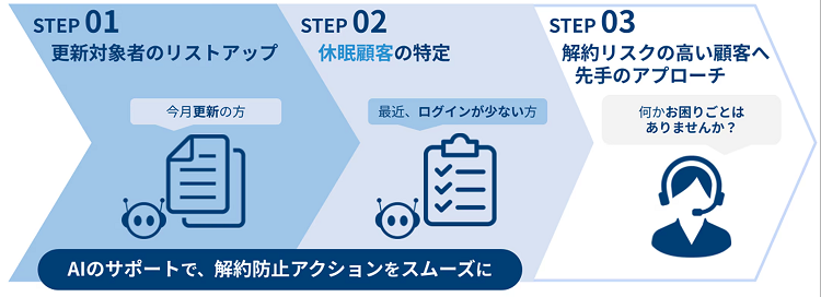 同AIエージェントは、サブスクリプション型ビジネスにおいて重要な課題となる解約リスクに自動で対応し、事業の安定した成長を支援することを目的としたもの。契約更新対象者のリストアップや休眠顧客の特定をAIが自動で行う点が特徴で、解約の可能性が高い顧客の効率的な抽出や最適なタイミングでのアプローチを実現する。従来手作業で行っていた顧客分析や対応が自動化されることで、企業は工数削減とともに、より戦略的な顧客対応が可能となる。