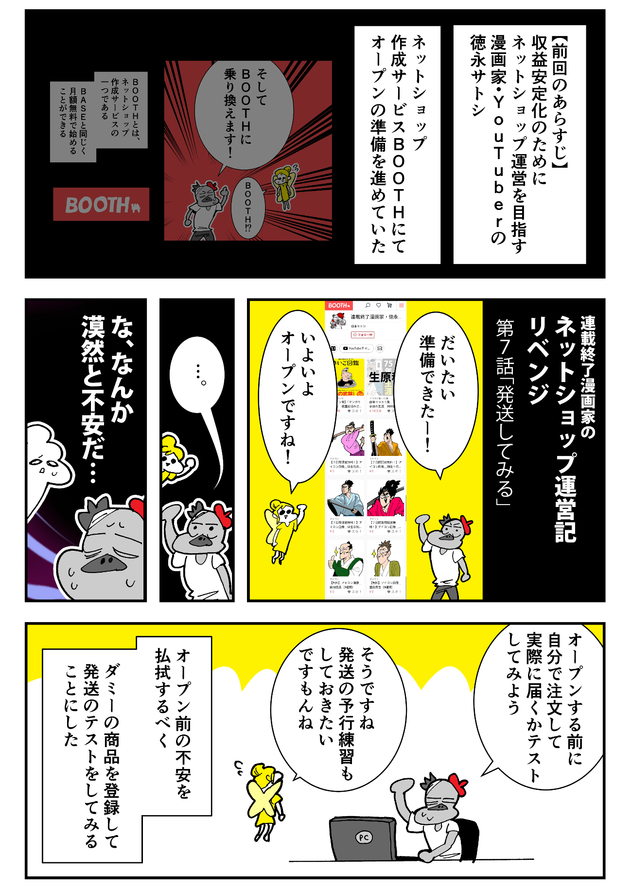 連載終了をきっかけにYouTube進出し、今では漫画家・YouTuberとして活動している徳永サトシ氏。さらなる収益の柱を作るため、オリジナルグッズの販売に取り組んでみましたが思うようにいかず、放置していたネットショップ運営を約1年9ヵ月ぶりに復活! 第7話は、「発送してみる」です。