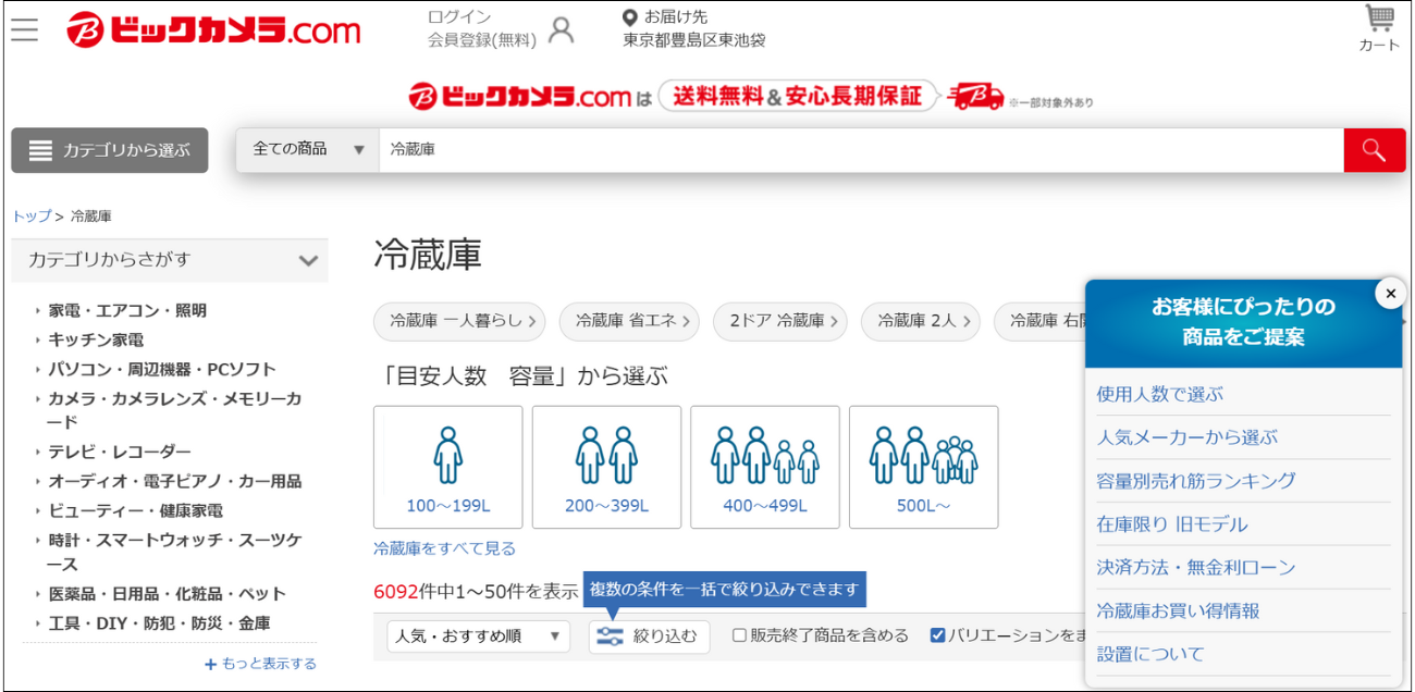 畑中 私たちはUXに非常にこだわっています。たとえば、ビックカメラ・ドットコムで「冷蔵庫」と検索すると、検索結果の右下にポップアップで「よくある質問」が表示されるんです。