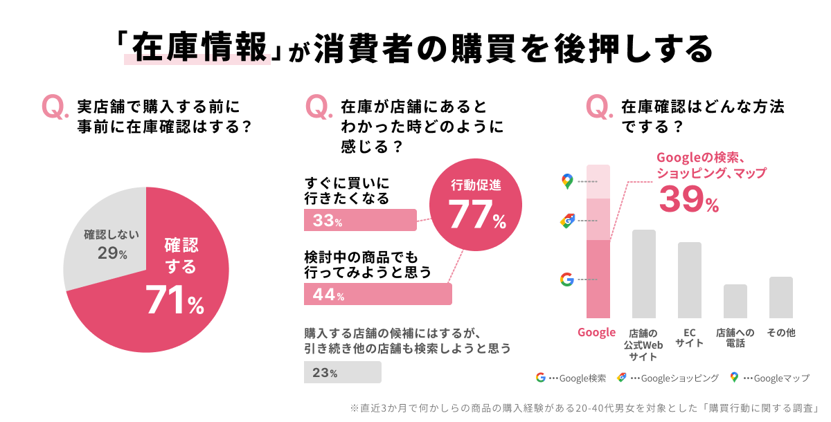同社の調査では、実店舗で購入前に在庫情報を確認する消費者は71%、在庫が店舗にあることで購買行動が促進される消費者は77%という結果が出ている。また、Google検索やGoogleショッピング、Googleマップを在庫確認の手段とする割合は39%と、自社サイトやECサイトを利用する割合を上回った。