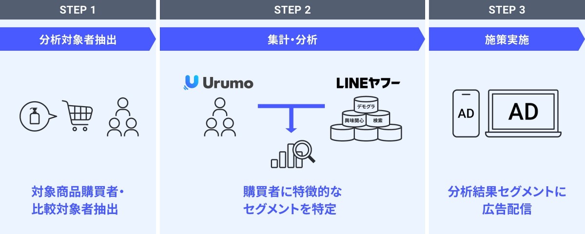 A・Bのユーザー群について、LINEヤフー社の持つYahoo! JAPANユーザーの属性(デモグラフィック)や興味関心、検索動向などのデータをもとに、購買ユーザー群Aに特徴的なセグメントを分析。量と質を担保した広告配信に最適なセグメントCを特定。