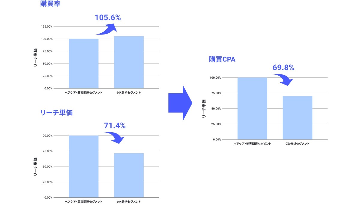 興味関心で「ヘアケア」「美容」に関連する従来型セグメントに比べ、購買率が5.6%向上し、リーチ単価も28.6%改善した。また、購買CPAも30.2%の改善となった。