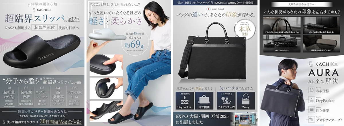 初回販売では、CO2やN2を用いた高機能EVA素材の超軽量「超臨界スリッパ」や、ドライポケットを備えた本革ビジネスバッグなどをラインアップ。今後もリュックサック、キャップ、ボストンバッグなど、日常使いしやすいアパレル雑貨が順次登場予定となっている