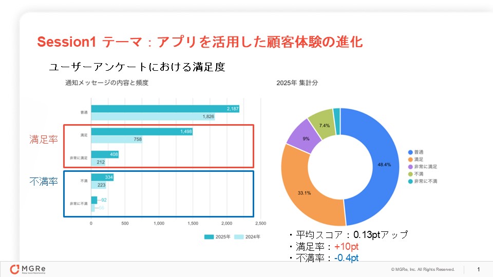 アプリデータの分析を行ったメグリは、プッシュ配信増による“痛み”が生じていないか確認するため、配信許諾率の推移や満足度にも目を向けた。すると、配信許諾率はやや微増、満足率の平均スコアは前年比で10ポイント増加し、情報提供数が増えたことによるプラス効果のほうが大きいとわかったという。
