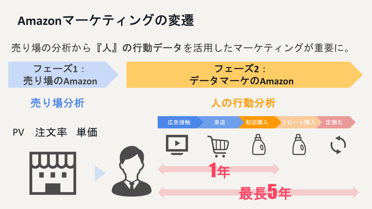 「従来のAmazonは、図に示した『フェーズ1:売り場のAmazon』の攻略が非常に重要でした。Amazon上の検索結果の上位をいかに取れるか、つまり実店舗でたとえるとメイン通路や定番の棚をしっかりと確保できるかで成果が大きく左右されていたのです。これを実現するため、私たちも広告活用をしたり、どの商品・キーワードで上位を狙うかといった戦略を日々議論したりして、成果向上を進めてきました。