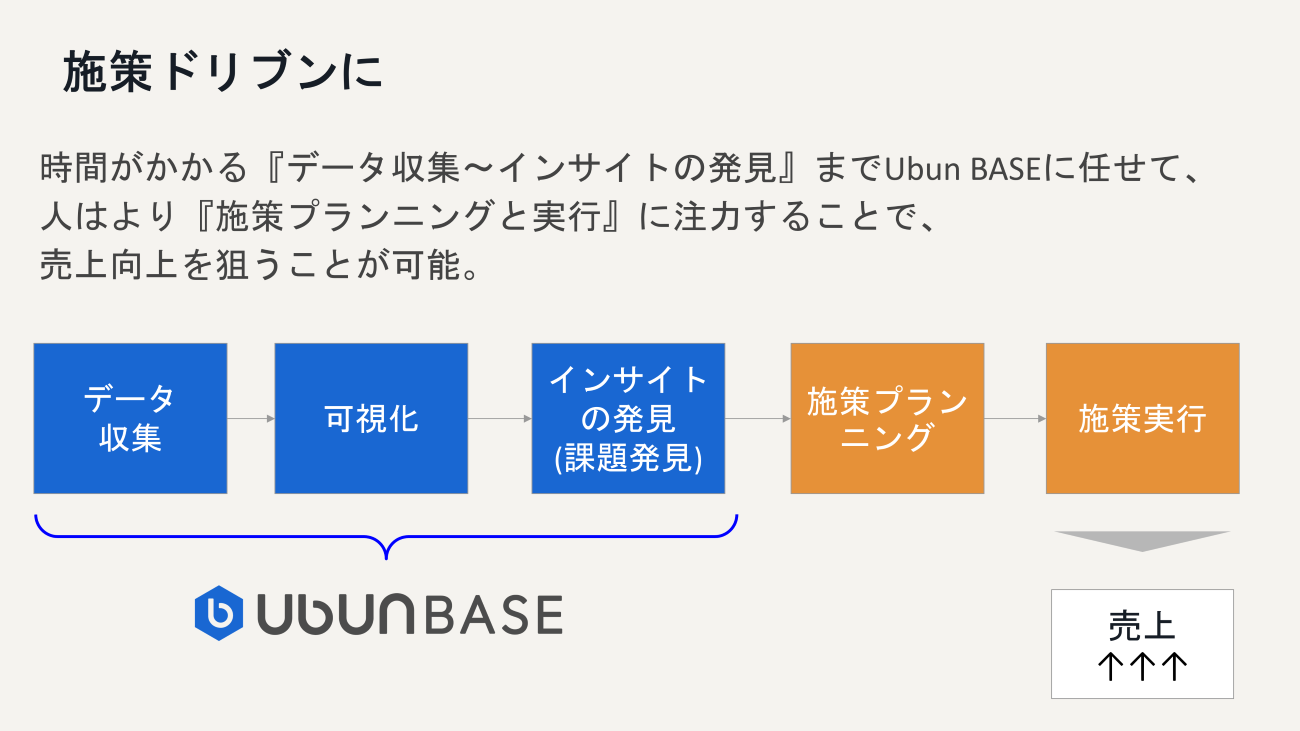 「報告書の作成、サマリーの蓄積に加え、広告の自動入札やレビュー、レコメンドに関するオペレーションの自動化といった機能提供も行っています。PDCAを回す上で最も時間を要するデータ収集・可視化・インサイトの発見のフェーズをUbun BASEに任せ、人間が行うべき施策のプランニングや実行へのリソース集中を実現します」(ウブン・笠井氏)