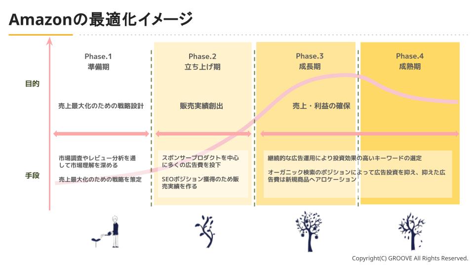 「Amazonの最適化を考える際には、まず自社のブランドが四つのうちどのフェーズにあるかを認識しましょう。売上最大化に向けた戦略策定、つまり市場調査や競合分析をすべきターンなのか、広告運用、主力商品を育てるべきターンなのか。一定の売上は上がるようになったが正しい拡大、撤退の判断をすべきなのか。これによって打ち手は変わります」(田中氏)