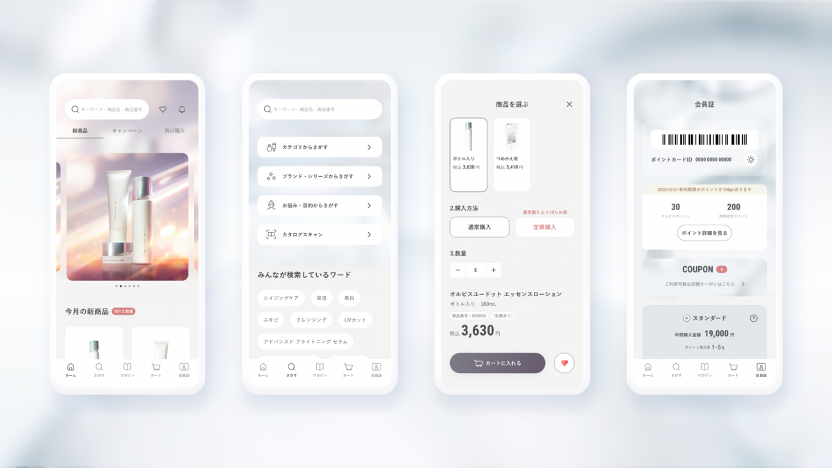 今回のリニューアルでは、ユーザーが求める情報へのアクセスを重視し、ホーム画面で新商品や人気商品ランキングを素早く確認できる仕様に刷新された。顧客ごとにパーソナライズされた情報提供や、「再び購入タブ」を設置し、以前購入した商品を再度購入しやすい仕組みも導入された。また、商品カテゴリ・ブランド・肌悩みなどの条件で商品検索が可能となり、商品の特徴や口コミ情報も閲覧しやすくなった。定期契約商品の管理や変更、カタログスキャンによる購入もアプリ上で容易に利用できる。