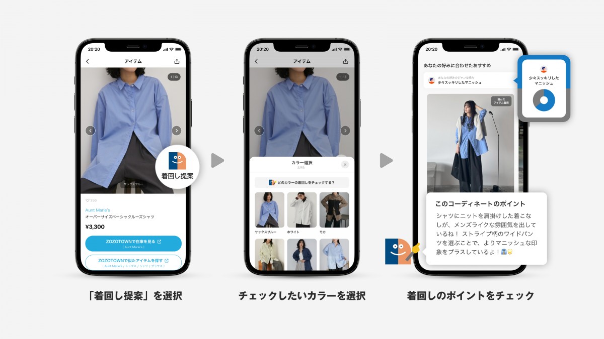 ZOZOは、運営するファッションコーディネートアプリ「WEAR by ZOZO」(以下、WEAR)に新機能「着回し提案」を追加した。ユーザーが特定のアイテムを選ぶと、ファッション特化AIがユーザーの好みに合わせた着回しコーディネートを画像とテキストで紹介。さらに、利用者が「体型の悩み」を登録することで、よりパーソナルな提案が可能となり、スタイルのポイントや体型カバーに関する解説も自動生成される。