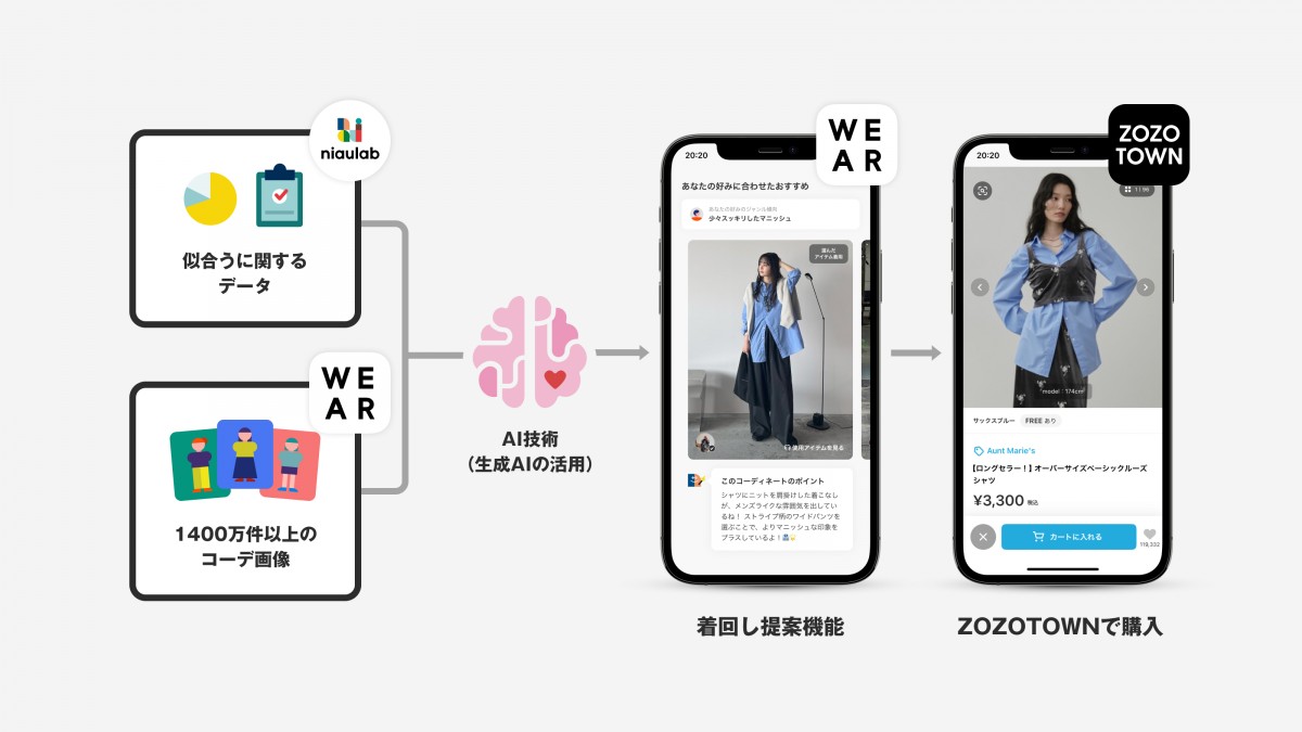 同機能に用いる画像は、WEARに登録されている1,400万件超のコーディネート画像とZOZOTOWNの商品データの連携を活用。気になったアイテムをアプリから直接購入できる。さらに、リアル店舗「niaulab by ZOZO」(以下、似合うラボ)で蓄積された「似合う」に関するデータやノウハウをAIの分析・提案ロジックと説明文生成に導入し、ユーザーのジャンルや体型への配慮を加えた最適なコーディネートを提示する。