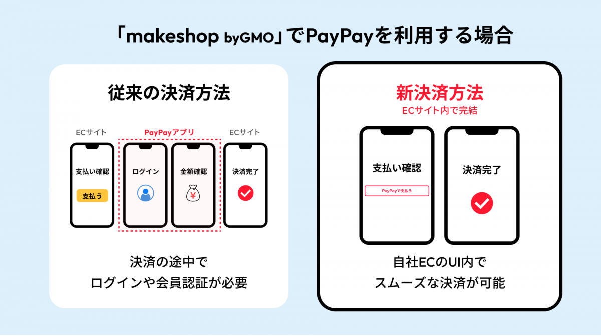 従来、ECサイトでPayPayを利用する際には、一度PayPayのアプリやブラウザへ遷移して決済を完了する仕組みが採用されていたが、今回GMOメイクショップはPayPayと包括代理店契約を締結し、双方のシステムをダイレクト連携。これにより、makeshop byGMOユーザーは自社ECサイトのUI内でPayPay決済をシームレスに完結できるようになり、決済時のカゴ落ち率低減、スムーズな顧客体験の提供が実現可能となる。