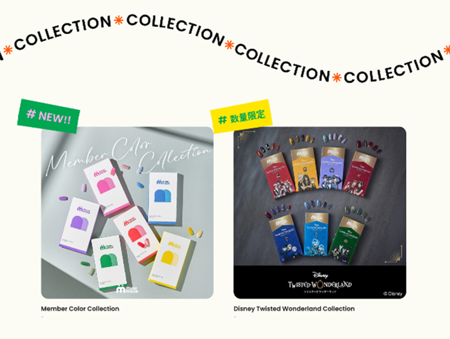 第1弾ではディズニーキャラクターとのコレクションや、アイドルグループの個々のメンバーのイメージを表現する「メンバーカラー」をテーマにしたデザインを発売。今後も複数のIPやインフルエンサーとのコラボを予定している。