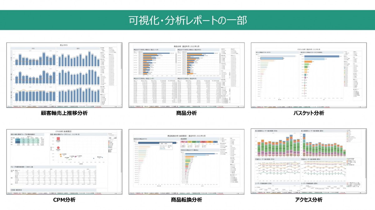 今回の連携サービスでは、自社ECやECモールなど、複数チャネルの購買履歴・商品・顧客データ、Googleアナリティクスのアクセスデータをひとつのダッシュボードに集約して可視化。属人的な集計業務を排除することで、データ分析の工数が、平均して月50時間から30分に短縮された。