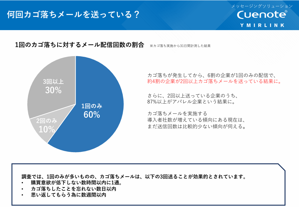カゴ落ちメール導入企業が5年間で3倍以上に、1回送信が6割/ユミルリンク調査