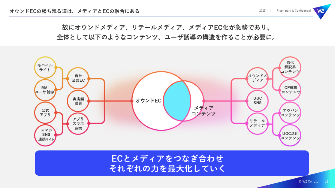 また、集客の観点からもメディア化は有効だ。従来のような広告による単発的な誘導だけでなく、SNSやオウンドメディア、UGC(ユーザー生成コンテンツ)などを有機的に結合させ、多角的にユーザーと接点を持つ必要がある。鴨下氏はこれを「融合化」と表現し、「ECとメディアがそれぞれ力を最大化していく」状態を目指すべきだと語る。