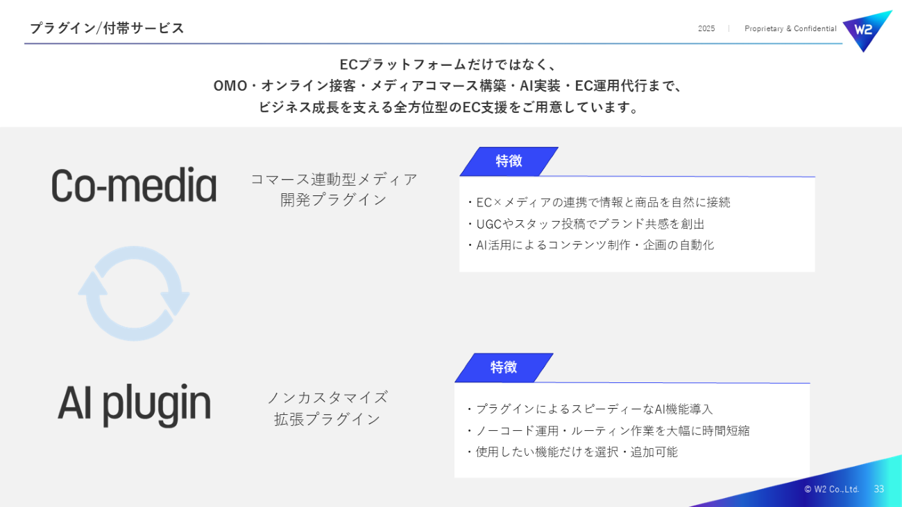 W2では、このECとメディアの融合を実現するために「Co-media(コメディア)」と「AI plugin」というソリューションを提供している。Co-mediaは、ECサイト内に記事や動画、スタッフ投稿などのコンテンツ機能を統合できるプラグインだ。これにより、ユーザーはコンテンツを楽しみながら、シームレスに商品購入へと進むことができる。