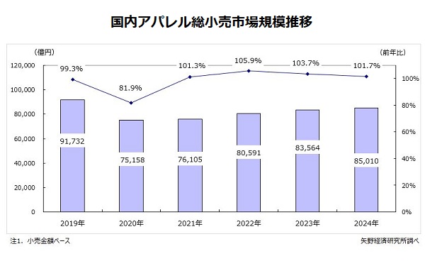 矢野経済研究所は2025年12月4日、2024年の国内アパレル市場に関する調査結果を公表した。紳士服・洋品、婦人服・洋品、ベビー服・洋品を合計した2024年の国内アパレル総小売市場規模は8兆5,010億円と推計され、前年比で101.7%となった。成長率は前年度より鈍化したものの、4年連続で市場規模が拡大した。コロナ禍前の2019年比では、約93%まで回復している。