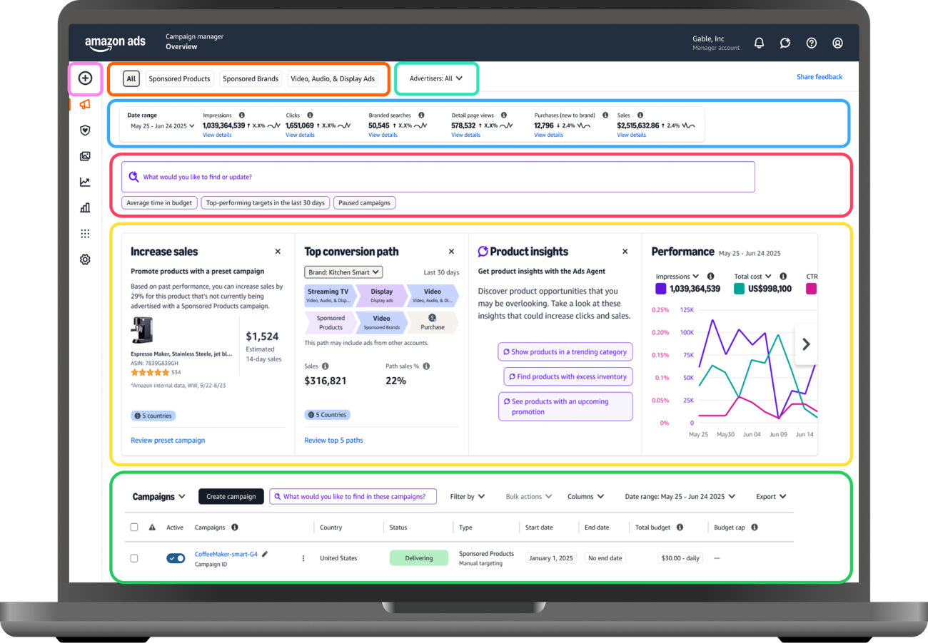 新たに登場したキャンペーンマネージャーは、従来分断されていた広告コンソールとAmazon DSPを統合。1つのワークスペース上で広告運用の設定から最適化までを一元的に管理できる。AIを搭載したガイダンスやスマート検索などの機能により、運用ワークフローの効率化や迅速な意思決定、KPIや効果分析の統一を実現。グローバルアカウントひとつで複数国の広告も一括運用可能となる。