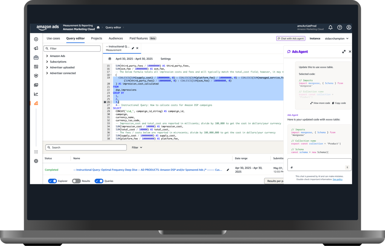 Ads Agent(アドエージェント)は、AmazonのデータクリーンルームソリューションであるAmazon Marketing Cloud(AMC)上で利用できるAIアシスタント機能だ。専門知識がなくても自然言語入力でSQLクエリを自動生成し、高度な分析やアクション自動化を実現する。これにより分析工数の短縮や意思決定の質向上を目指す。さらに、関連性の高いオーディエンスの提案・設定機能も2026年第一四半期に日本で提供予定である。