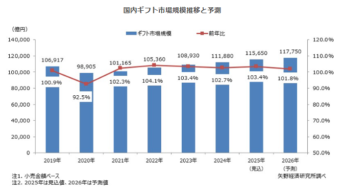 矢野経済研究所は2026年2月13日、国内ギフト市場の調査結果を発表した。調査によると、2024年の国内ギフト市場規模(小売金額ベース)は前年比102.7%の11兆1,880億円となった。2025年には同103.4%の11兆5,650億円に拡大すると見込んでいる。