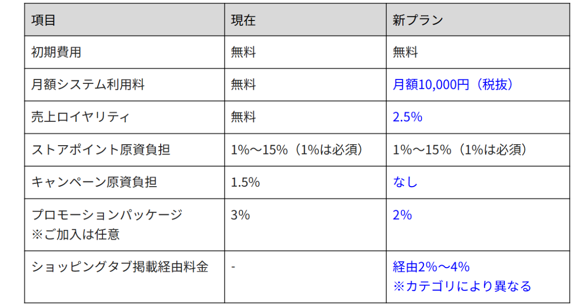 また、ショッピングタブ掲載経由の商品販売に対しても、カテゴリーごとに2%~4%の手数料が新たに適用される。ストアポイント原資は従来通り必須の1%~15%のまま変更はないが、キャンペーン原資負担は廃止となる。プロモーションパッケージは、3%から2%に変更される。