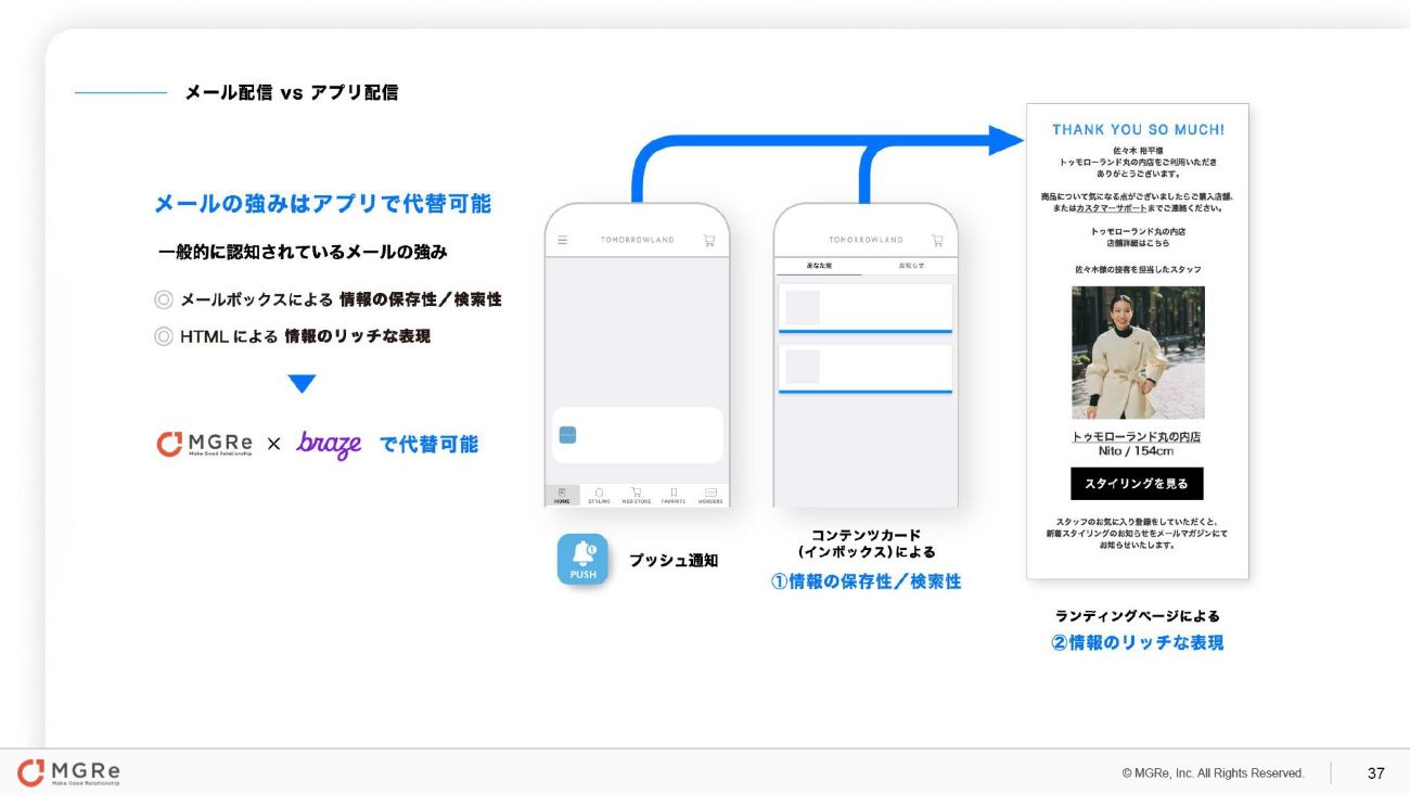 上田氏は、「メールの強みである情報の保存性やHTMLによるリッチな表現は、今やMGReとBrazeの組み合わせで代替可能。マルチチャネルをオーケストレーション(統合制御)することが不可欠になっている」と指摘する。
