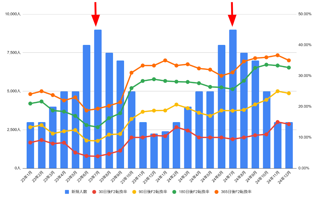 F2転換は獲得人数の母数に影響されることが多いので合わせて確認できるようにしておくと良いです。このテストデータだと、獲得人数が多い夏頃には、F2転換が下ブレていることが読み取れます。ただ、2023年と2024年の夏を比べると転換率のベースが向上しているので、初回~F2までのコミュニケーション変更がうまくいったことが読み取れます。これも全体から確認して、初回商品別や顧客セグメント別にブレイクダウンして確認していきます。