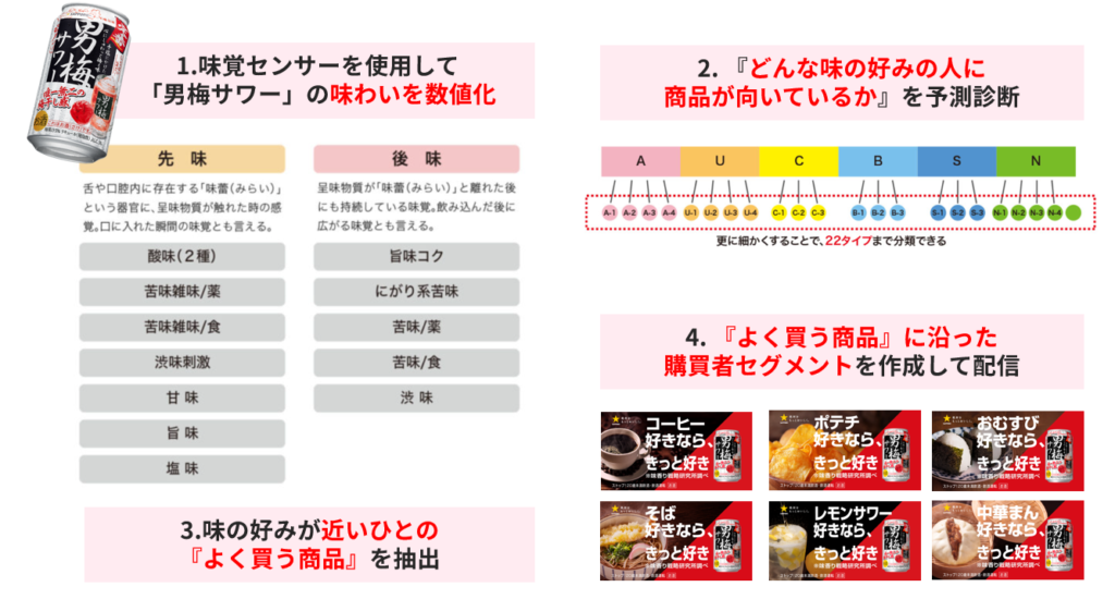 同サービスは、対象商品の味わいを味香り戦略研究所の味覚センサー技術によって数値化し、消費者の潜在的なニーズを可視化。22の嗜好タイプに分類して味の好みが近いグループに属するユーザーを抽出し、購買傾向の高い商品に沿った広告を配信する仕組みである。