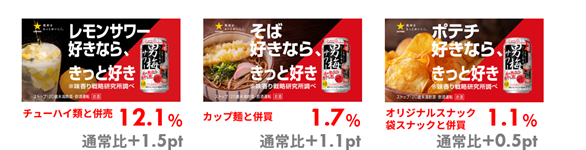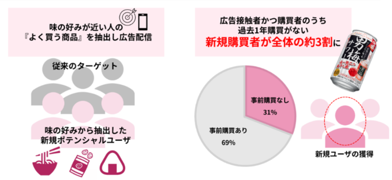実証にあたっては、サッポロビール「サッポロ 男梅サワー」を例に、該当商品を好むと見なされるグループへの広告配信を実施。コーヒーやカップ麺、スナック菓子の購買者からも新規ユーザー獲得につながり、嗜好性を訴求した広告クリエイティブへの高い反応や、類似嗜好商品の同時購買傾向も明らかになったという。