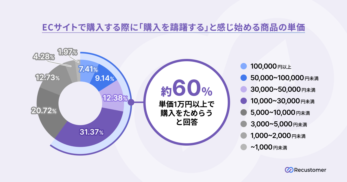 ECでファッションアイテムを購入する際の購入金額について、もっとも多かった価格帯は「1万〜3万円未満」だった。また、約60%が「1万円以上」でためらいを感じると回答した。