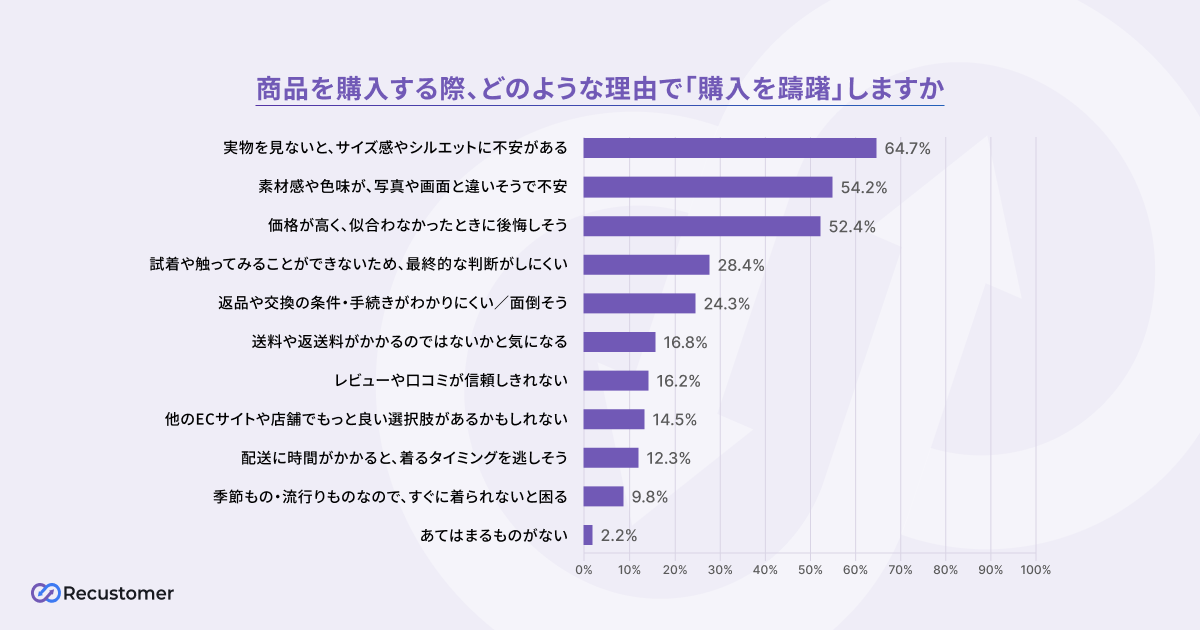 購入をためらう最大の理由には、「実物を見ないとサイズやシルエットに不安がある」という項目が挙げられ、64.7%が回答。次いで「素材や色味が写真と異なりそう(54.2%)」、「価格が高く、似合わなかった場合に後悔しそう(52.4%)」など、実物確認にまつわる不安が多く挙がった。