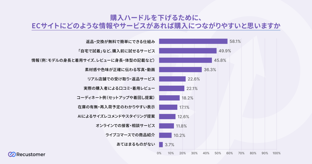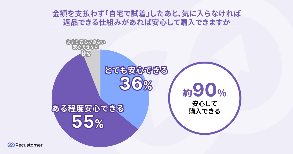 購買を後押しする要素として、「返品・交換が無料で簡単にできる仕組み(58.1%)」や「自宅で試着できるサービス(49.9%)」の需要が高いことも明らかとなった。「実物確認ができればECの購入ハードルは下がる」と答えた人は約9割に達し、「自宅で試着し、気に入らなければ返品できる」仕組みがあれば約9割が「安心して購入できる」と回答した。