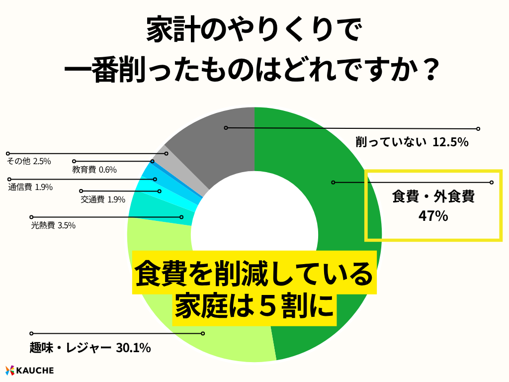 支出削減の中心は食費・外食費で、47%が削ったと答え、次いで趣味・レジャーが30.1%となった。日々の節約対象として、まず食卓から見直す動きが見られる。