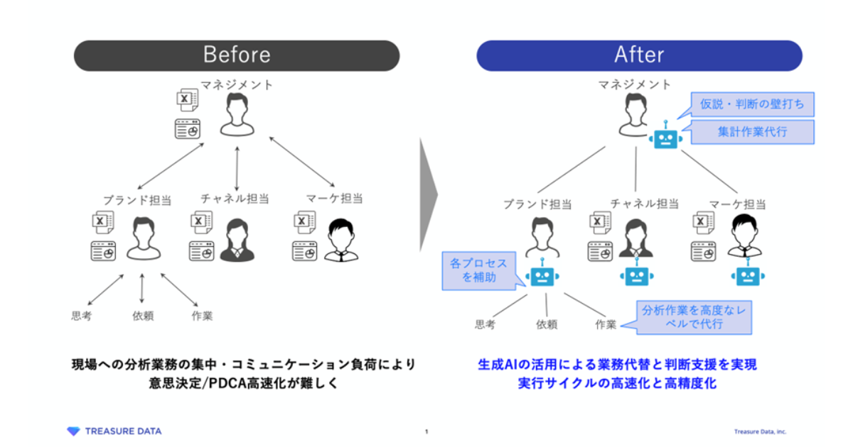 この課題に対応するため、「Treasure Data CDP」上でAI活用を本格化。「AI Agent Foundry」により、経営、マーケティング、現場オペレーションなど各業務領域に最適化されたAIエージェントを構築することで、CDPに蓄積された顧客データや財務データを迅速に分析し、意思決定や日々の業務に関する支援を行う。