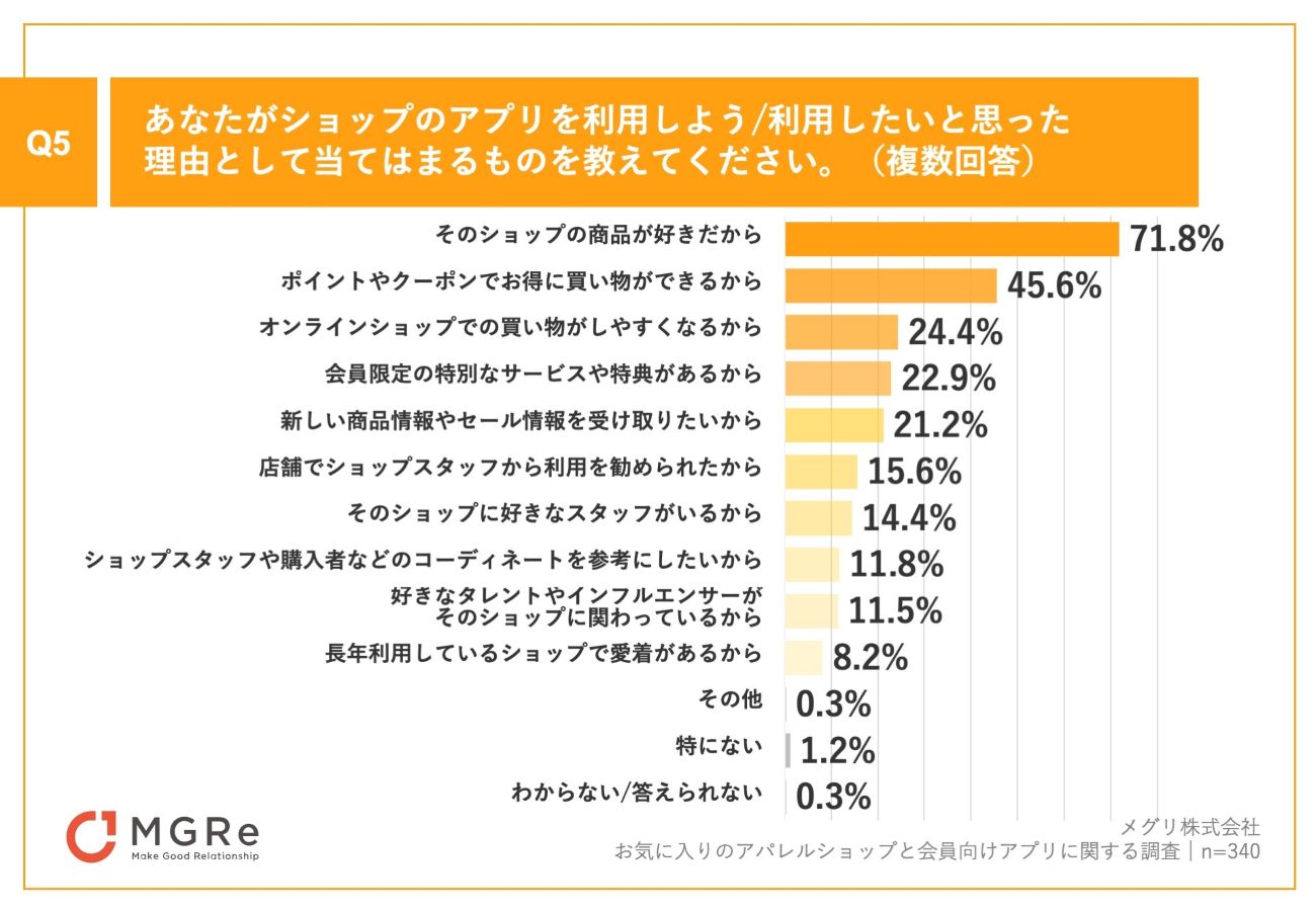 「アプリがあり、現在利用している」「アプリはないが、あれば利用したいと思う」と答えた人に対する利用動機を聞く質問では、「そのショップの商品が好きだから」が71.8%で最も多く、「ポイントやクーポンでお得に買い物ができるから」の45.6%を大きく上回った。続いて「オンラインショップでの買い物がしやすくなるから」が24.4%、「会員限定の特別なサービスや特典があるから」が22.9%と続いた。