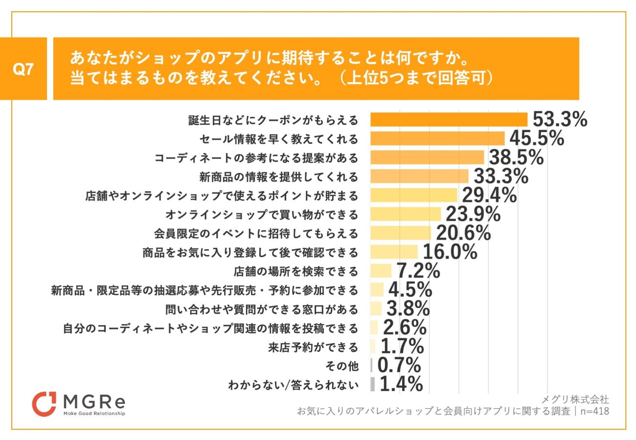 アプリに対する期待としては、「誕生日などにクーポンがもらえる」が53.3%で最多だった。他には「セール情報を早く教えてくれる」(45.5%)、「コーディネートの参考になる提案がある」(38.5%)が上位にあげられている。「店舗やオンラインショップで使えるポイントが貯まる」(29.4%)や「会員限定のイベントへの招待」(20.6%)なども一定のニーズを示した。