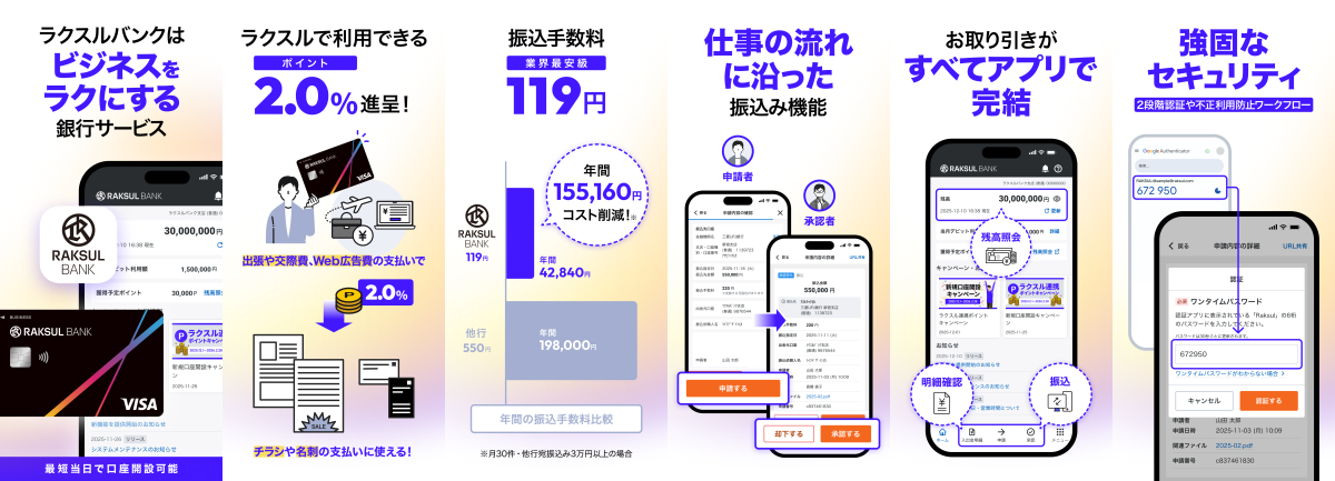 ラクスルバンクでは、法人向け口座の開設をパソコンやスマートフォンから申込可能とし、書類のペーパーレス化やオンラインでの本人確認により、審査条件を満たせば最短で当日利用が可能となっている。口座開設後は、即時で振込や入金、残高照会、取引履歴ダウンロードなどが利用できる。