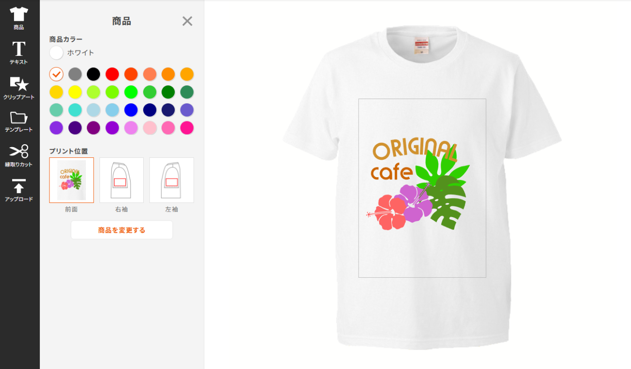プリントデザイナーは、ブラウザおよびスマートフォンから直感的な操作でオリジナルデザインの作成ができるツールである。画像の切り抜きや色変更、種類豊富なフォントや文字の変形機能、テンプレートも備えており、専門知識がなくても手軽に独自デザインが完成する。利用者が作成したデータは「デザインキー」として発行され、キーを商品ページに貼り付けることで、作成したデザインの商品を購入できる。