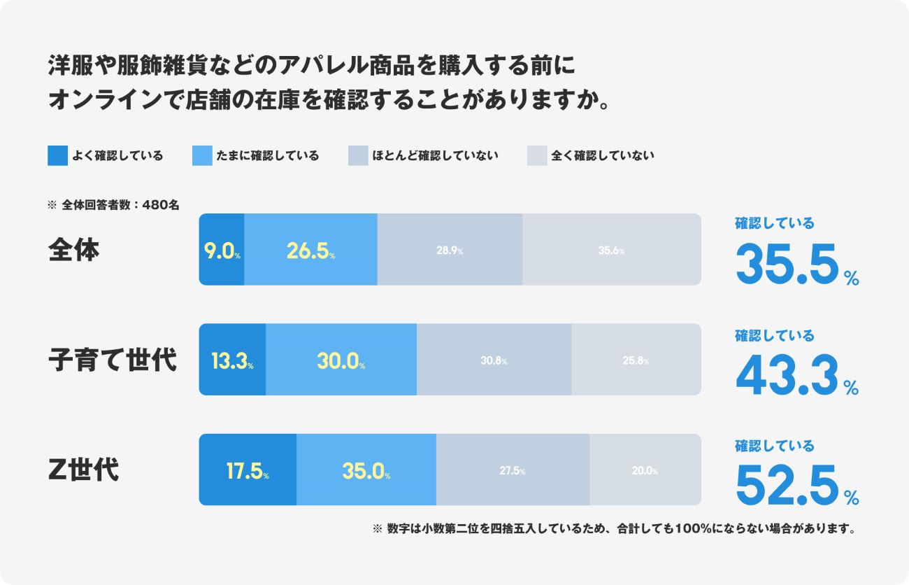 同調査によると、アパレル用品購入の際、約3人に1人(35.5%)が実店舗へ行く前にオンラインで店舗の在庫状況を確認していることが明らかとなった。
