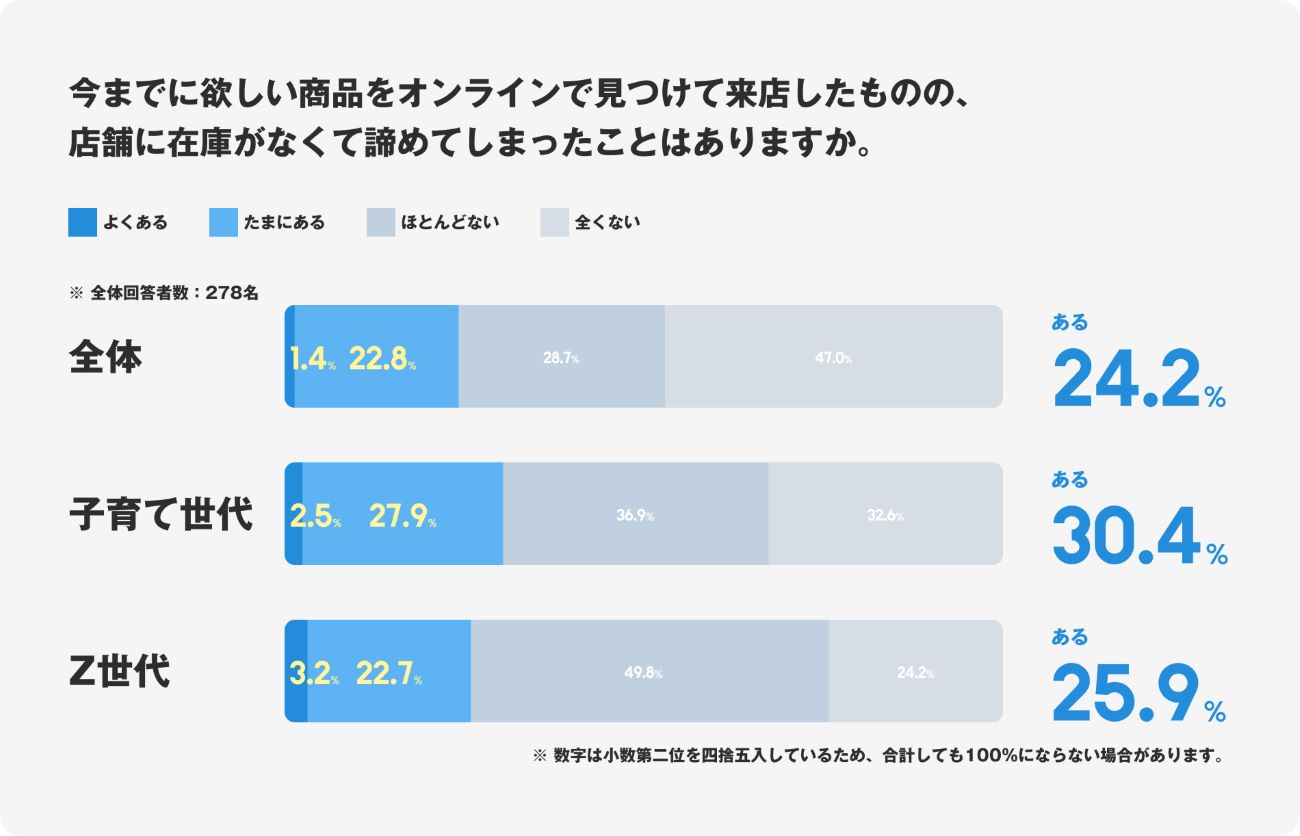 同調査では、オンラインで店舗在庫を事前確認しない人にも追加質問を実施。「今までにオンライン上で欲しい商品を見つけて来店したものの、店舗に在庫がなくて諦めてしまったことはありますか?」といった質問に対しては、約4人に1人(24.2%)が欠品によって商品購入を諦めた経験があると回答した。特に、同選択肢の回答は子育て世代で30.4%と多く、サイズ展開の多い子ども服のサイズ欠品の多さが要因として考えられるとZOZOは分析している。