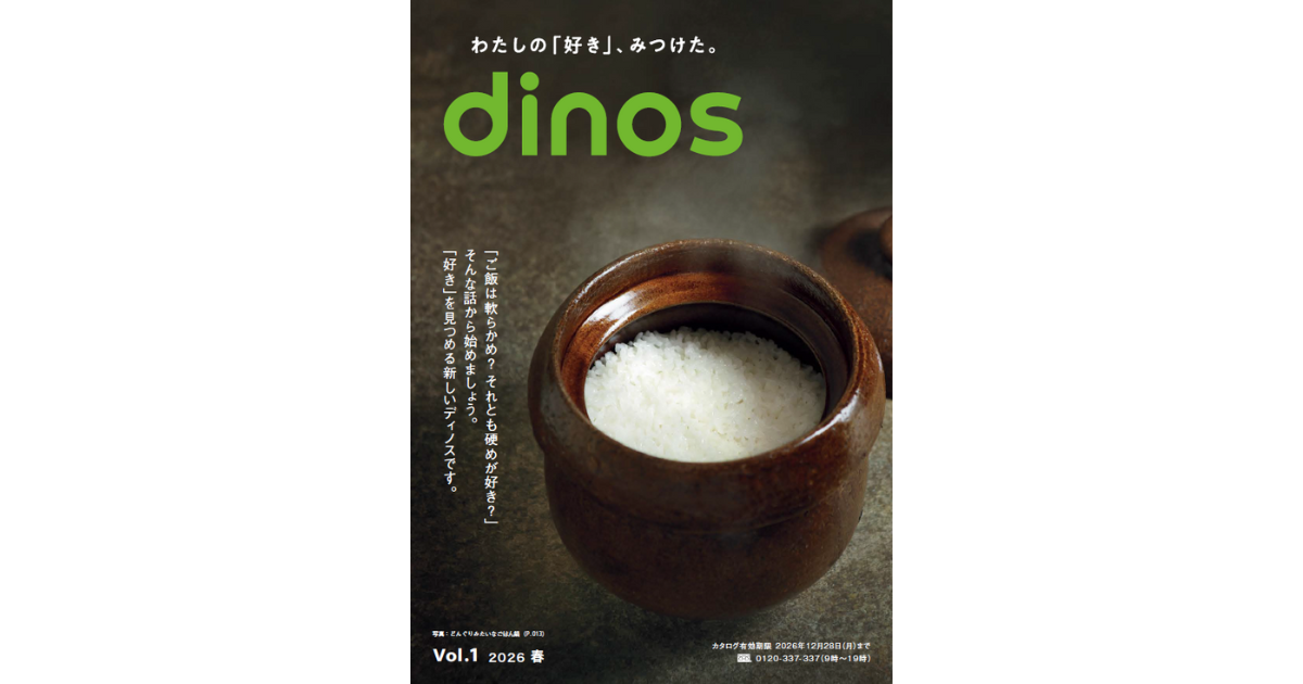 dinosは2026年1月6日、基幹カタログ『DINOS STORY』を『dinos』にリニューアルすると発表した。また、同日より『dinos 2026春号 vol.1』の配布を開始した。今回のリニューアルは、2025年4月に発表したブランドメッセージ「わたしの『好き』、みつけた。」を反映したもので、カタログのコンセプトおよび誌面デザインを大幅に刷新した。