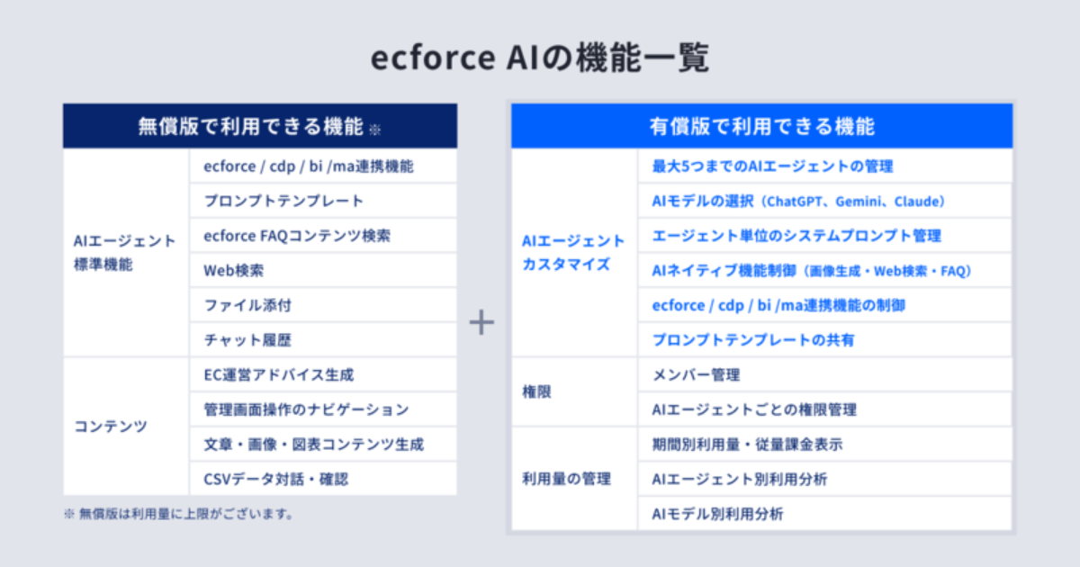 料金体系は、月額費用に加えAIモデルの利用量に応じた従量課金制。ecforceあるいはecforce cdp導入事業者が利用可能で、未導入の場合は先に導入が必須となる。