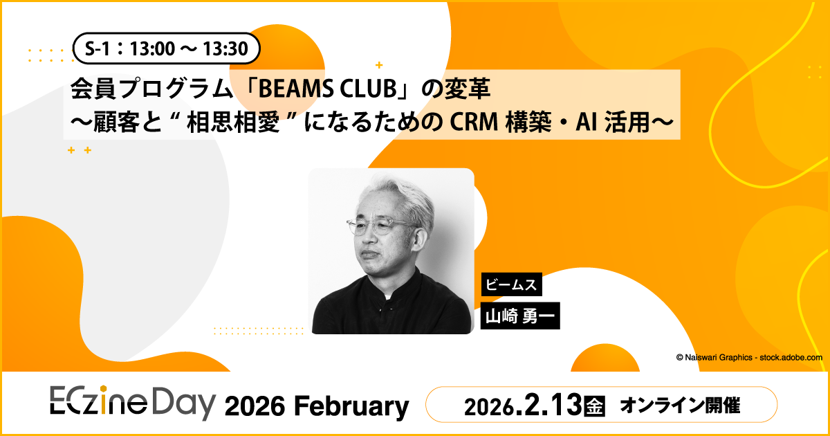 翔泳社が2026年2月13日に開催する「ECzine Day 2026 February」。本イベントでは、OMOやCRM、AI活用など、今向き合うべきコマース戦略が幅広く提示される。注目セッションの一つが『会員プログラム「BEAMS CLUB」の変革~顧客と“相思相愛”になるためのCRM構築・AI活用~』だ。