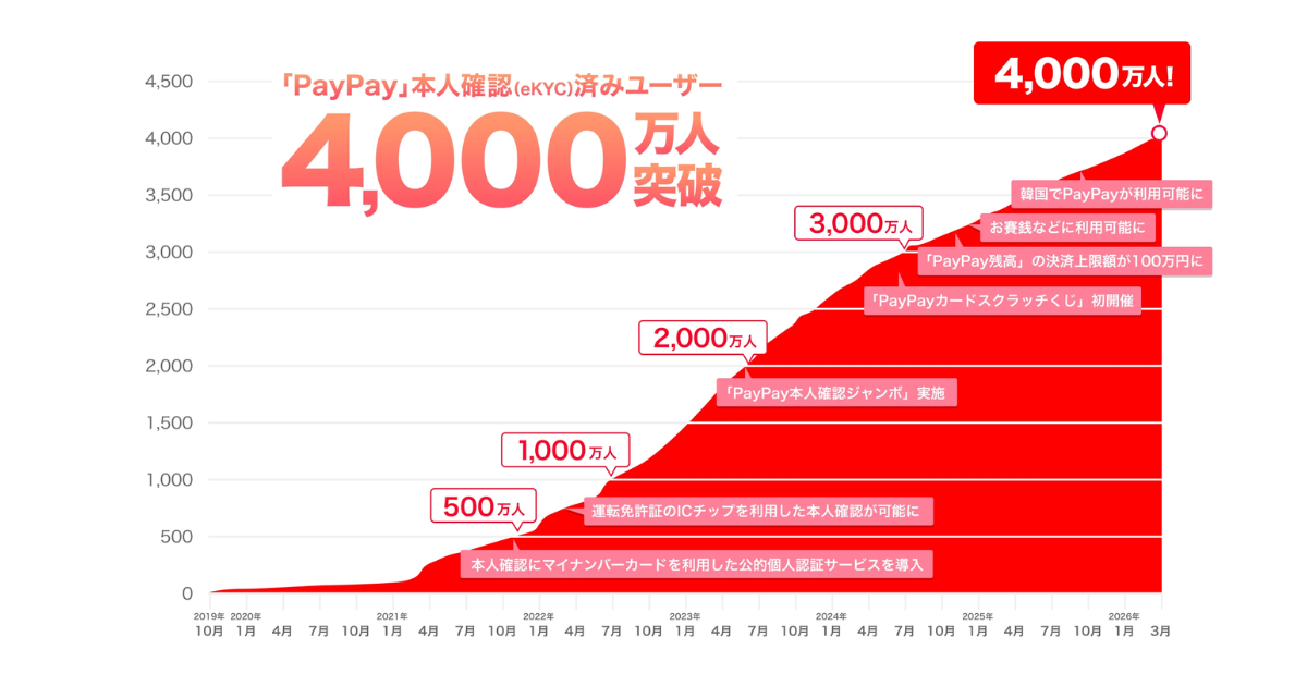 2026年3月18日、PayPayは自社キャッシュレス決済サービス「PayPay」における本人確認(eKYC)済みユーザー数が、4,000万人を突破したと発表した。PayPayの登録ユーザー総数は7,300万人(2026年3月時点)であり、本人確認済みユーザーの割合が着実に増加している。