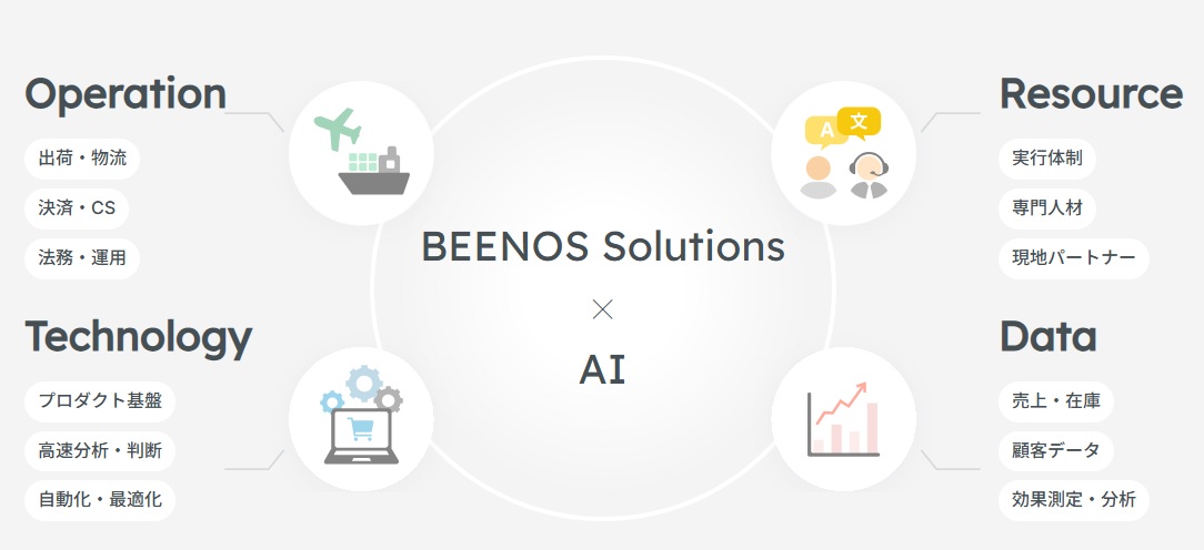 2026年4月1日、BEENOSグループは越境EC支援事業の組織再編および連結子会社の商号変更を発表した。今回の再編では、BeeCruiseのGlobal Growth Hack事業部を分割しFASBEEへ統合。さらにFASBEEの商号を「BEENOS Solutions」へと変更し、新体制で事業を開始した。