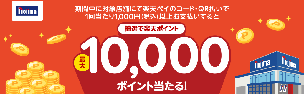 今回の導入を記念し、2026年5月1日から5月31日まで「ノジマでのお支払いで最大10,000ポイントが当たるキャンペーン」が実施される。キャンペーンでは、専用ページからエントリーのうえ、キャンペーン期間中に対象店舗で楽天ペイを使い、1回あたり1,000円(税込)以上支払った利用者の中から、抽選で7,800名に楽天ポイントが進呈される。特典は、1等(50名)10,000ポイント、2等(250名)3,000ポイント、3等(7,500名)100ポイントとなっている。ポイント進呈は2026年7月末頃までに行われ、有効期限付きポイントとなる。