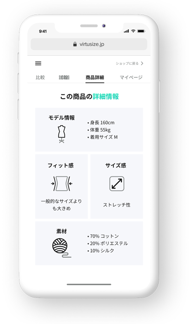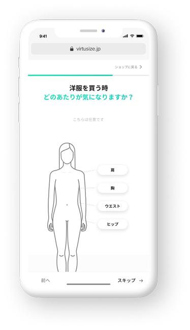 体の基本情報と気になる部分を入力すると、Virtusizeの高度な機械学習アルゴリズムにより、ユーザーは自分自身の実物に近いパーソナライズシルエットを作成。シルエットと商品を比較することで、自分の体型にぴったりの商品を見つけることができる。