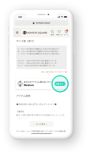 各商品ページにはサイズガイドボタンを表示。商品ページから移動することなく、理想のサイズを見つけることが可能に。購入履歴やすでに体のデータ作成を行っているユーザーには、おすすめサイズが表示、新規ユーザーには、商品のサイズ感が表示され、シンプルなパーソナライズサイズレコメンドを可能にする。サイズガイドをクリックするとバーチャサイズが開き、サイズ詳細を確認できる。