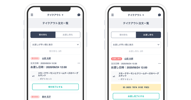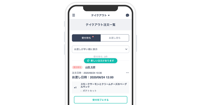 購入者からのテイクアウトの注文は、 ショップオーナーが受付完了の操作を行うことによって正式に受領となり、購入者にも通知される。 また、 テイクアウトの受付が完了した商品は、 渡し待ちのタブに移動するため、受付前とお渡し前の注文管理がわかりやすくなっている。